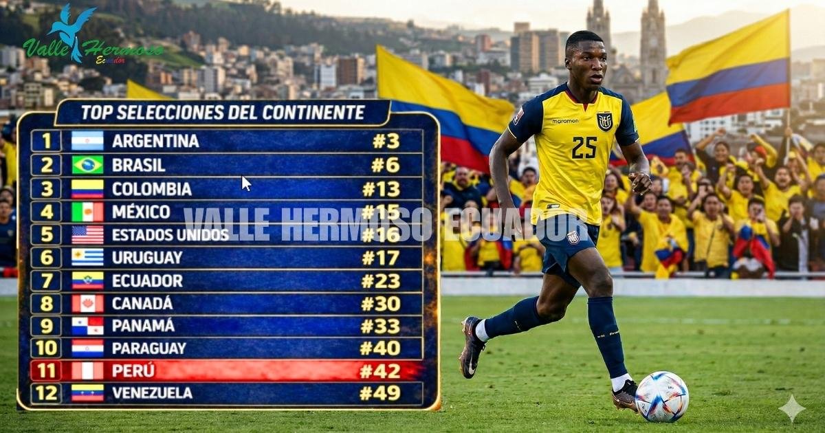 - Contexto Regional: Dentro de la CONMEBOL, Ecuador se posiciona por debajo de potencias como Argentina (3º), Brasil (6º), Colombia (13º) y Uruguay (17º), pero por encima de Paraguay (40º), Venezuela (49º), Perú (53º) y Chile (54º).
