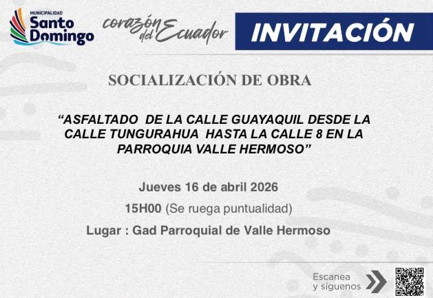 VALLE HERMOSO – La Municipalidad de Santo Domingo ha convocado a una reunión de Socialización para este jueves 16 de abril de 2026, a las 15H00, en las instalaciones del GAD Parroquial. El tema central: el esperado asfaltado de la Calle Guayaquil, en el tramo comprendido desde la calle Tungurahua hasta la Calle 8.
